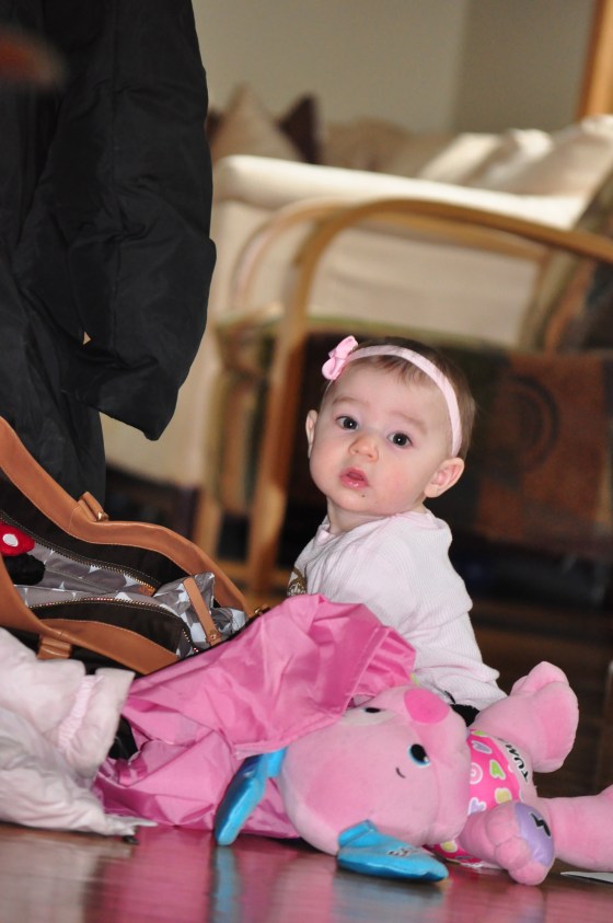G has magnificent eyes. One day A will be very jealous of those! Hopefully one day J won’t be so scared of A & she can move her one girl show into the family room with these guys! She decided on her own that she didn’t want to be the cause of J’s sadness so she went to empty my bag in the foyer!